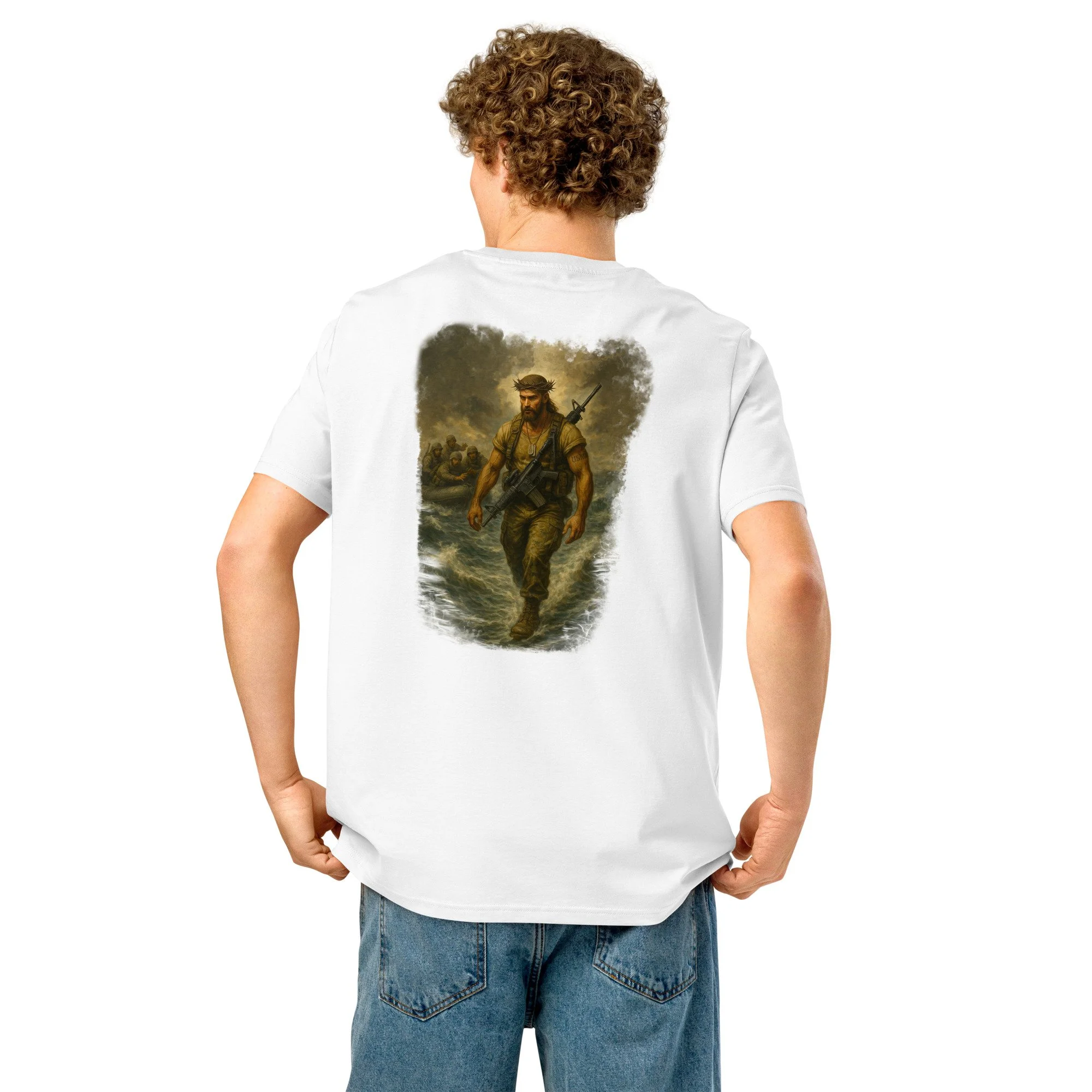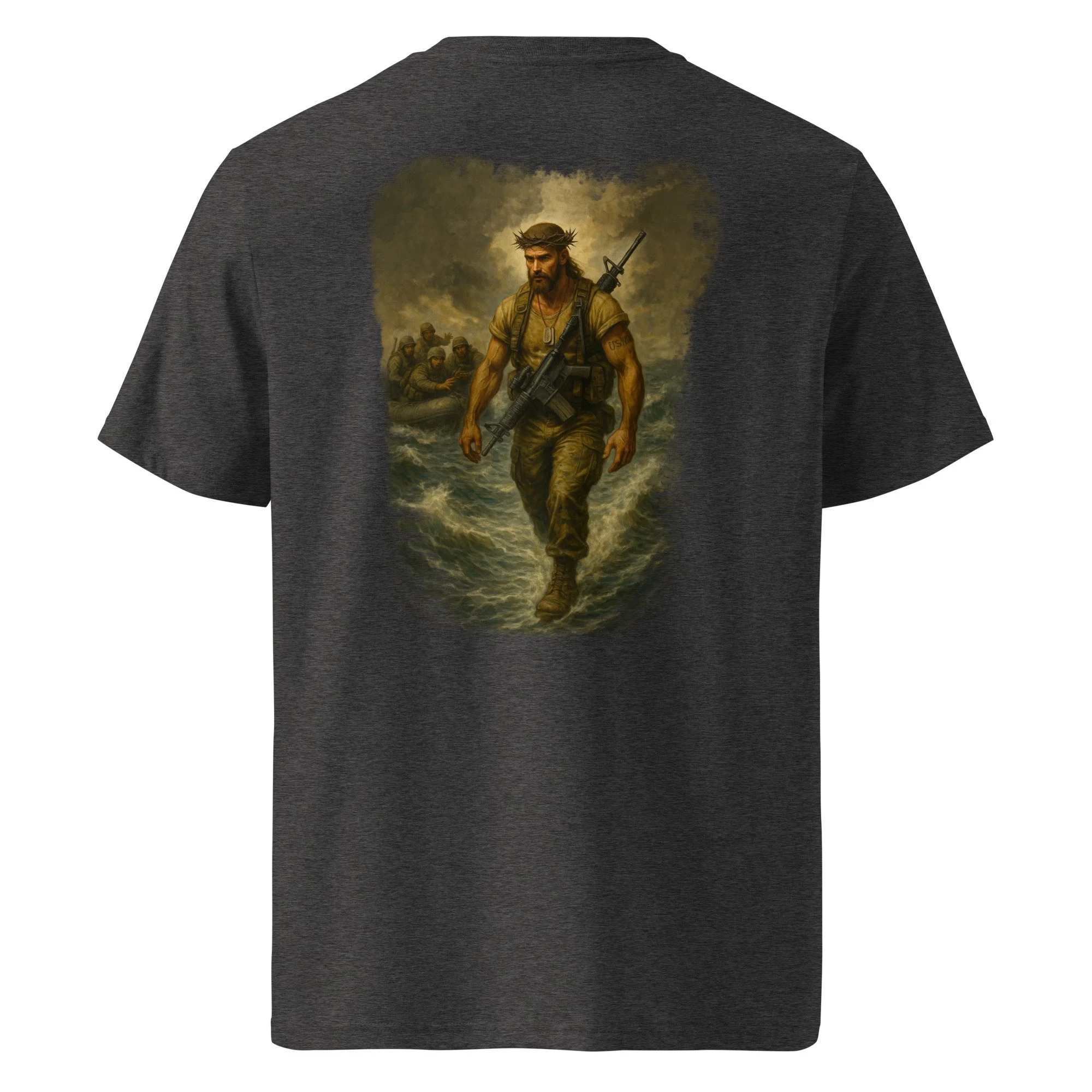 Jarhead Jesus: Walking on Water brings a little swagger, a little faith, and a little holy irreverence to the mix. This design captures that impossible moment when conviction steps straight into chaos and keeps moving. It is bold, slightly unhinged, and exactly the kind of shirt that makes people look twice, laugh, think, and start talking.